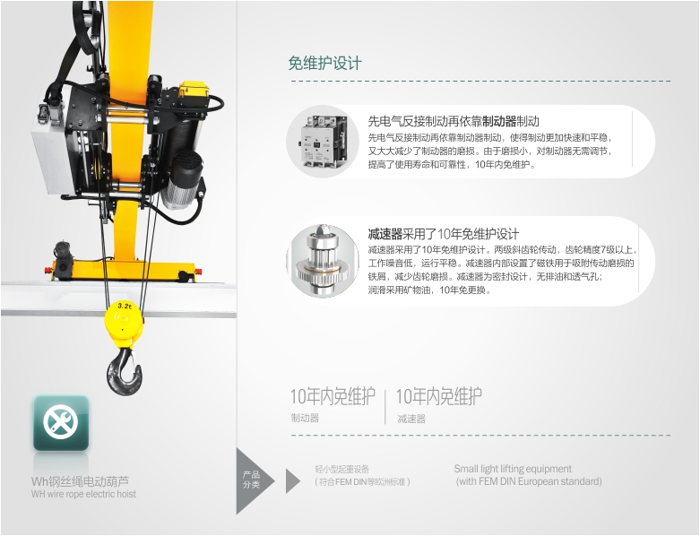 節(jié)能環(huán)  保等優(yōu)勢。電動葫蘆應(yīng)用8項專利技術(shù),零部件采用模塊化制造工藝,通用性強,免維護率高,易損件少。