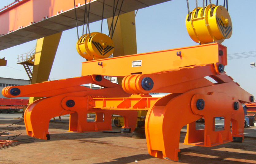 7、 雙吊點夾鉗吊具靠自重鎖緊,開閉器定位,自動實現(xiàn)鉗口的開閉工作,不消耗電能,有利于環(huán)保。結(jié)構(gòu)簡單,制造方便,價格便宜,外形尺寸小,自重輕。