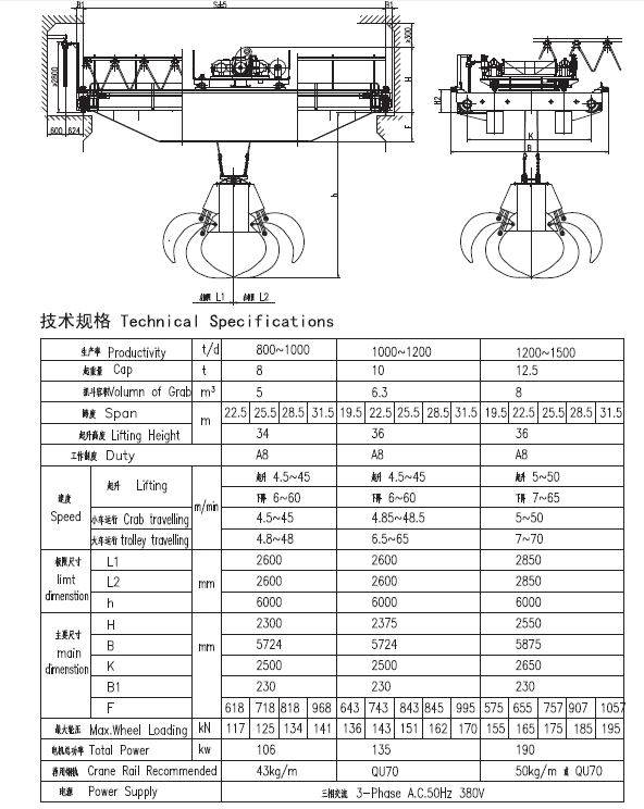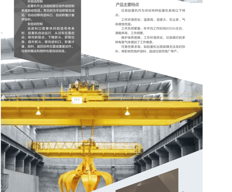 2、 我公司生產(chǎn)的垃圾抓斗起重機能執(zhí)行嚴(yán)格的提升及輸送作業(yè),確保垃圾焚燒發(fā)電廠的正常作業(yè)。